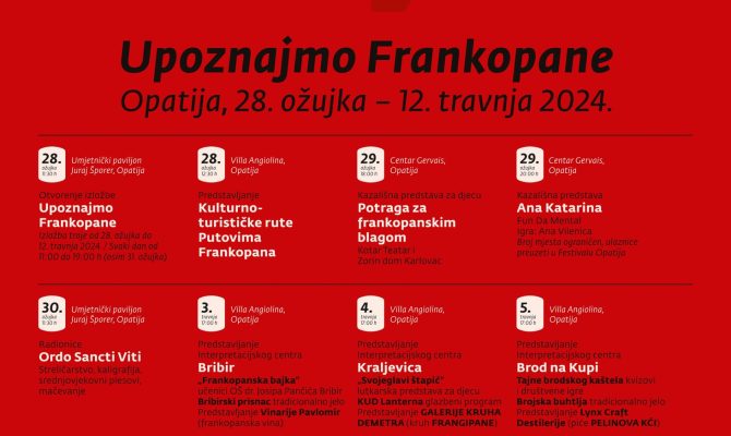 Otvaranjem putujuće izložbe “Upoznajmo Frankopane” u Umjetničkom paviljonu Juraj Šporer u Opatiji započela je manifestacija “Frankopani u Opatiji” koja će trajati do 12. travnja. Izložbu koja spaja kulturnu, gastronomsku i turističku ponudu naše županije svečano […]
